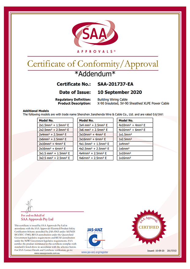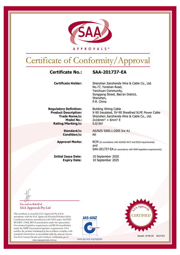 深圳建圳達電線電纜有限公司,成立于2000年,是一家電線電纜制造商,我們通過了世界各地不同市場的多數(shù)認證,如:CCC、RoHS、CB、SAA、TUV、VDE、PSE、BPS、UL、CSA。我們根據(jù)定制產品不斷更新新的認證。經過數(shù)十年的發(fā)展,我們與來自世界各地的客戶建立了長期的合作關系。我們曾經是菲律賓機場,,柬埔寨的電力站,美國的醫(yī)院,工廠,埃塞俄比亞的水電站項目。我們是一家值得信賴的電線供應商。